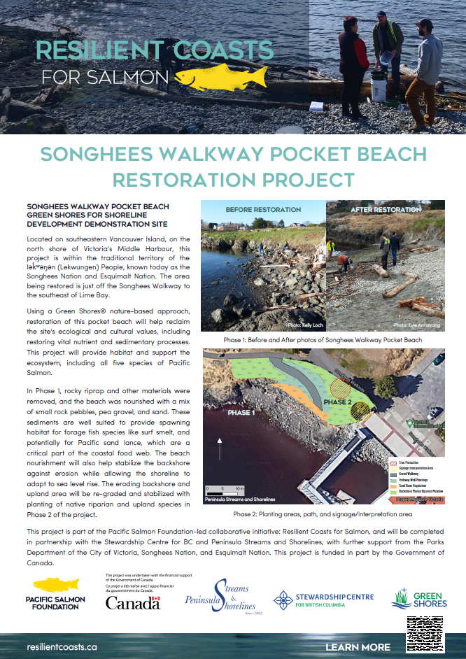 Resilient Coasts for Salmon is working with their partner organization, Peninsula Streams and Shorelines, to develop a Green Shores demonstration site at the Songhees Walkway Pocket Beach. Other partners include the City of Victoria, Ralmax Group of Companies, Salish Sea Industrial Services, and the Songhees Nation and Esquimalt Nation.
